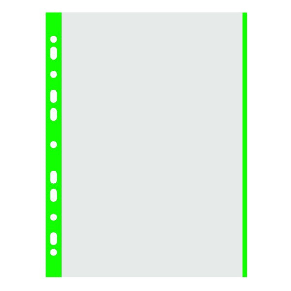 Univerzális, 11 lefűzőlyukkal, megerősített élekkel rendelkező lefűzhető genoterm dokumentumok gyűrűskönyvekben, iratrendezőkben történő, lyukasztás nélküli tárolására. A színes oldalcsíkok megkönnyítik a behelyezett dokumentumok rendszerezését. Víztiszta, antisztatikus és tükröződésmentes.