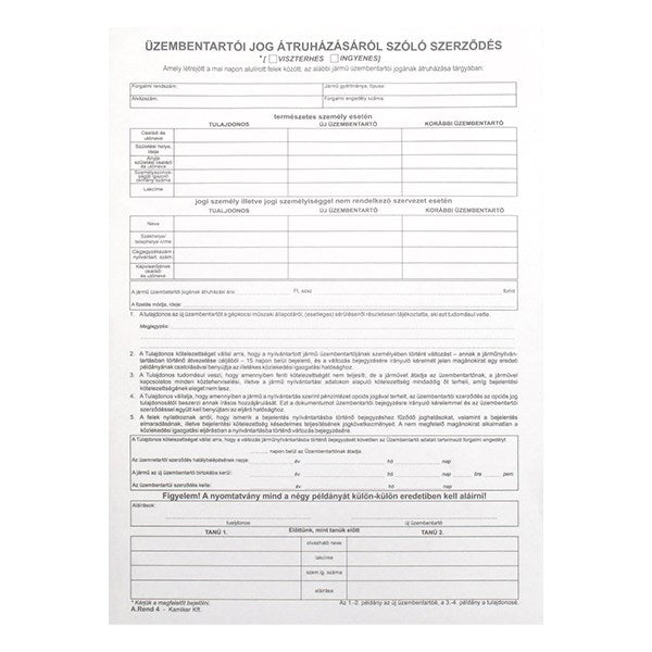 Nyomtatvány üzembentartói szerződés VECTRALINE A/4 4 példányos