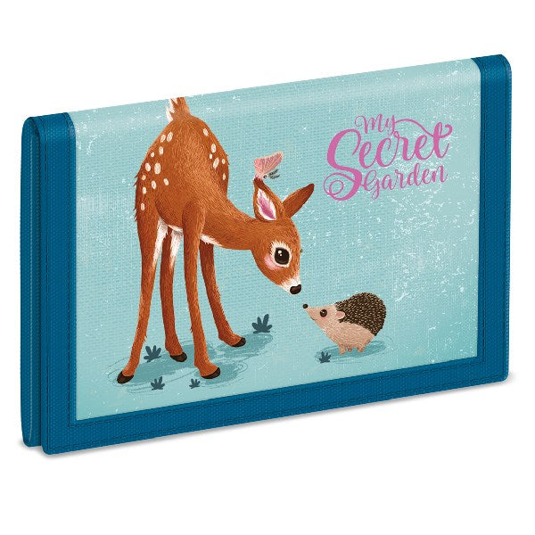 Tépőzáras pénztárca, hátulján cipzáros zsebbel az aprópénznek. Belsejében papírpénz-, valamint bérlet- és kártyatartó rekesszel. Összehajtható. Tartós, dupla varrású szegéllyel.