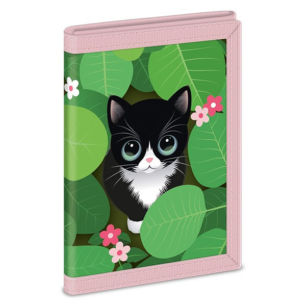 Tépőzáras pénztárca, hátulján cipzáros zsebbel az aprópénznek. Belsejében papírpénz-, valamint bérlet- és kártyatartó rekesszel. Összehajtható. Tartós, dupla varrású szegéllyel.