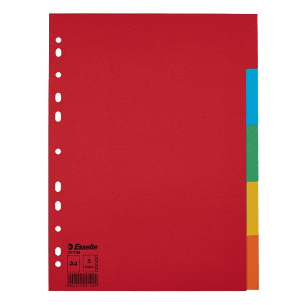Tartós elválasztólap élénk színkombinációkban. Újrahasznosított karton alapanyag. 5 színes fül a könnyű rendszerezéshez. Hagyományos, 11-lyukú lefűzőrész. A4 formátum. Erős, 160 g-os karton alapanyag. Blue Angel minősített, újrahasznosított karton alapanyag.
