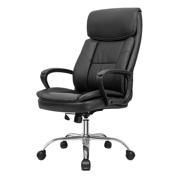 Főnöki forgószék magas textilbőr háttámla. Fejtámla kiképzés. Max. terhelhetőség 150 kg. Magasságállítás-gázliftes. Állítható rugózási keménységű. A forgószék ülésmagassága állítható, krómozott fém erősített lábkereszt. A forgószék dönthető. A magas és ívelt háttámla egyenletes támasztást biztosít a gerincnek. Ülőfelület fekete PU textilbőr: 54x53cm. Szék teljes magassága: 98,5-116 cm