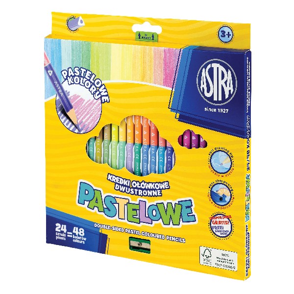 Színes ceruza ASTRA Duo háromszögletű kétvégű pasztell ajándék hegyezővel 48 színű