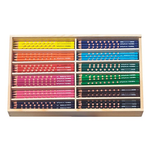 Ergonomikus háromszögletű színes ceruza fa dobozban.