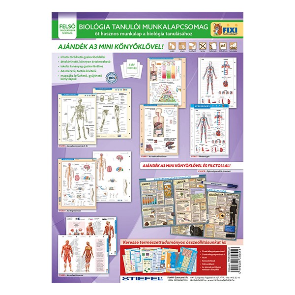 5 db tanulói lap 1 db Egészségnevelés alátéttel és kék filctollal. A Fixi tanulói munkalapok a magyar oktatásban széleskörűen használt falitérképek és oktatótablók kicsinyített másai, nemcsak az órai munkát, hanem az otthoni gyakorlást is megkönnyítik. Minden munkalap írható-letörölhető, cseppálló fóliabevonattal készül, a lyukasztás pedig megkönnyíti a gyűjtését és tárolását a lapoknak. Az Egészségnevelési alátétemberi vázizomzat két oldalas alátétünk rendhagyó módon mutatja be az ember izomzatát. Az alátét másik oldala, az Érzékszervek eredeti, körvonalaiban, színeiben jól tagolt ábrákon mutatja be az emberi érzékelés öt szervét.
