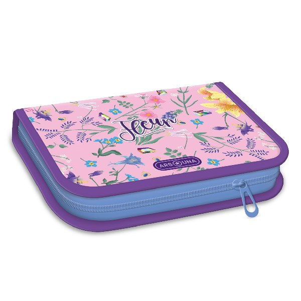 Írószerekkel töltött cipzáros tolltartó két kihajtható füllel, gumis kialakítással az írószerek tárolásához. Tartalma: 12 db színes ceruza, 3 db HB grafit ceruza, 1 vékony és 1 vastag postairón, 8 db színes filctoll, 1 db radír, 1 db hegyező, 1 db 17 cm-es egyenes vonalzó, 1 db háromszög vonalzó, órarend A és B hétre.