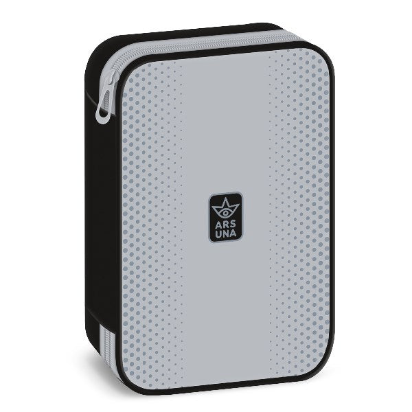 Többszintes, töltetlen, cipzáras tolltartó. Belül textillel bevont merev lapokkal, gumis kialakítással 30 ceruza számára az írószerek tárolásához és egy cipzáras belső zsebbel.