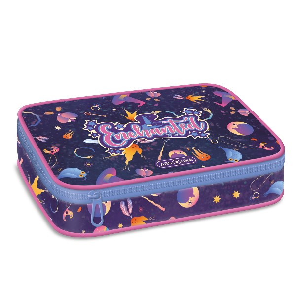 Többszintes, töltetlen, cipzáras tolltartó. Belül textillel bevont merev lapokkal, gumis kialakítással 30 ceruza számára az írószerek tárolásához és egy cipzáras belső zsebbel.