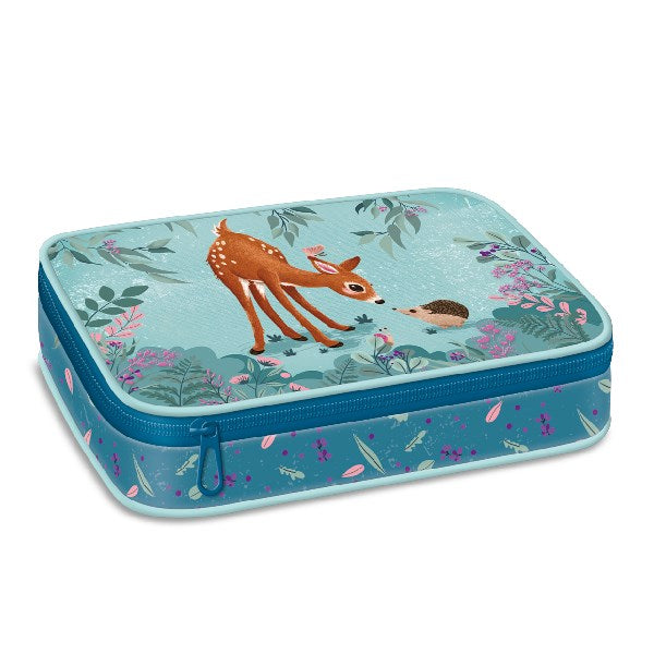 Többszintes, töltetlen, cipzáras tolltartó. Belül textillel bevont merev lapokkal, gumis kialakítással 30 ceruza számára az írószerek tárolásához és egy cipzáras belső zsebbel.
