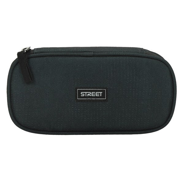 Belül textillel bevont merev lapokkal, gumis kialakítással az írószerek tárolásához, és egy cipzáras belső zsebbel.