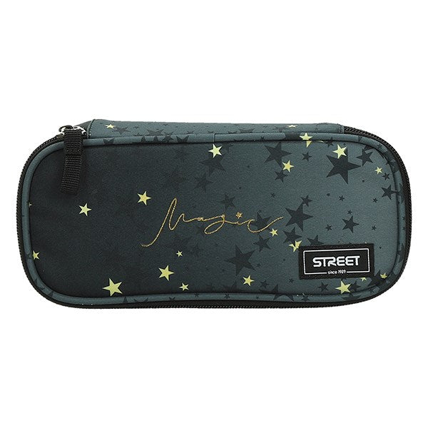 Belül textillel bevont merev lapokkal, gumis kialakítással az írószerek tárolásához.
