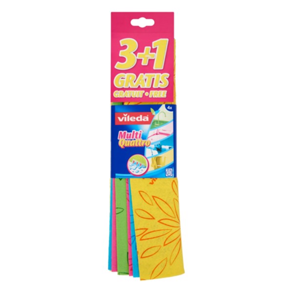 A Vileda Multi Quattro 3+1 törlőkendő négy fiatalos színben kapható, mely akár 4 különböző helyiségben használható!