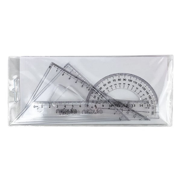 Iskolai vonalzókészlet jól olvasható számskálával. A készlet tartalma: 1 db 15 cm-es egyenes vonalzó; 1 db 60°-os, 15 cm-es számskálájú háromszög vonalzó; 1 db 45°-os, 11 cm-es számskálájú egyenlő szárú háromszög vonalzó; 1 db szögmérő.
